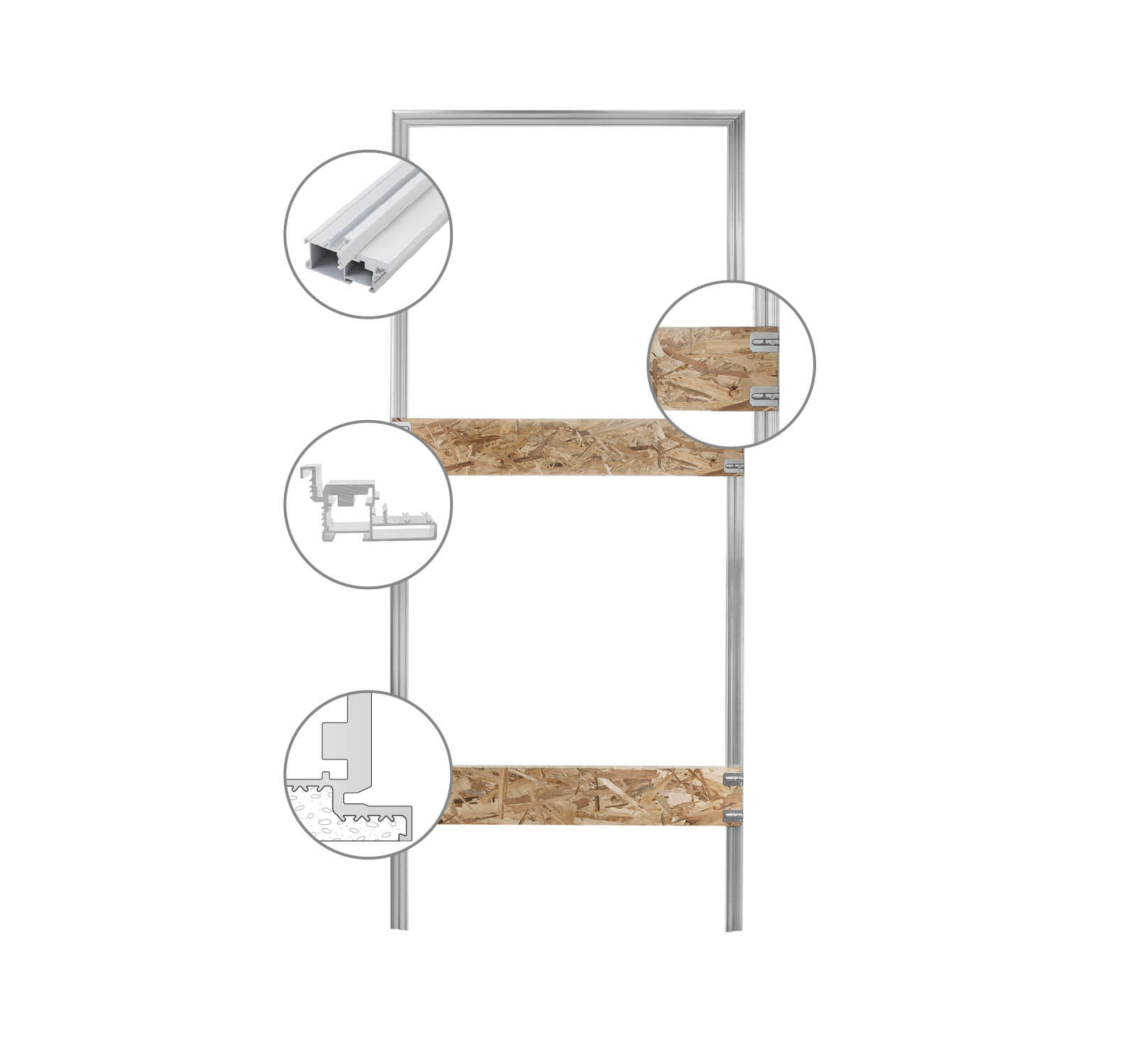 Puzdro je vyrobené z hliníka a váži približne 2 kg na bežný meter, čo z neho robí jedno z najpevnejších na trhu! Navyše, aby sa zabránilo jeho znečisteniu alebo poškriabaniu na stavenisku, vyvinuli sme špeciálne ochranné prvky, najmä na ochranu priestoru pre pánty pred omietkou alebo stierkou (verzia dverí na ťahanie).