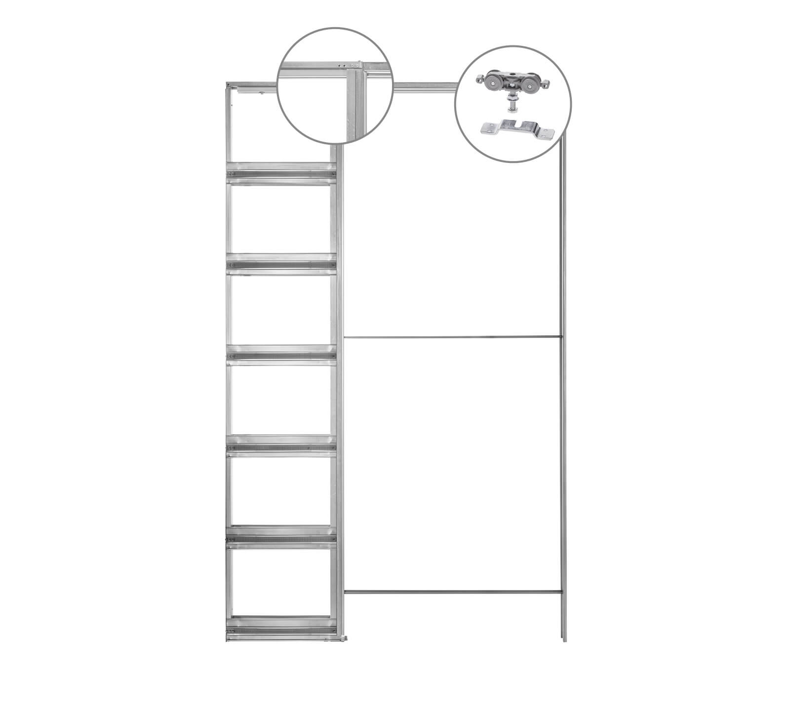 ECLISSE Zhrnovacie puzdro, ktoré umožňuje osadiť sekčné dvere, zatiaľ čo jedna časť dverného panelu sa zasúva do steny, druhá sa otvára ako krídlové dvere. Tento systém umožňuje dosiahnuť štandardnú šírku priechodu aj tam, kde je priestor na inštaláciu puzdra obmedzený.